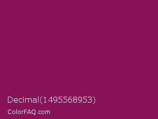 Decimal 1495568953 Color is a dark magenta color and the nearest color is Disco #871550. Hex code #881257 and RGB value is rgb(136,18,87). In RGB color space, this color is composed of 53% red, 7% green, 34% blue, In CMYK color space, this color is composed of 0% cyan, 87% magenta, 36% yellow , 47% black , In HSL color space, this color has a hue angle of 325° , 77% saturation and 30% lightness.
