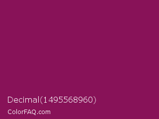 Decimal 1495568960 Color is a dark magenta color and the nearest color is Disco #871550. Hex code #881258 and RGB value is rgb(136,18,88). In RGB color space, this color is composed of 53% red, 7% green, 35% blue, In CMYK color space, this color is composed of 0% cyan, 87% magenta, 35% yellow , 47% black , In HSL color space, this color has a hue angle of 324° , 77% saturation and 30% lightness.