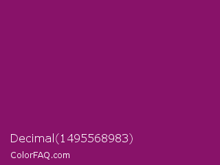Decimal 1495568983 Color is a dark magenta color and the nearest color is Cardinal Pink #8c055e. Hex code #881269 and RGB value is rgb(136,18,105). In RGB color space, this color is composed of 53% red, 7% green, 41% blue, In CMYK color space, this color is composed of 0% cyan, 87% magenta, 23% yellow , 47% black , In HSL color space, this color has a hue angle of 316° , 77% saturation and 30% lightness.