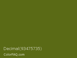 Decimal 93475735 Color is a dark lime color and the nearest color is Saratoga #555b10. Hex code #5a6a15 and RGB value is rgb(90,106,21). In RGB color space, this color is composed of 35% red, 42% green, 8% blue, In CMYK color space, this color is composed of 15% cyan, 0% magenta, 80% yellow , 58% black , In HSL color space, this color has a hue angle of 71° , 67% saturation and 25% lightness.