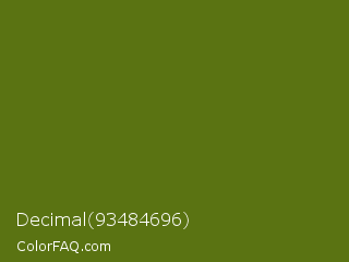Decimal 93484696 Color is a dark lime color and the nearest color is Fern Frond #657220. Hex code #5a7312 and RGB value is rgb(90,115,18). In RGB color space, this color is composed of 35% red, 45% green, 7% blue, In CMYK color space, this color is composed of 22% cyan, 0% magenta, 84% yellow , 55% black , In HSL color space, this color has a hue angle of 75° , 73% saturation and 26% lightness.