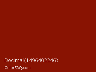 Decimal 1496402246 Color is a dark red color and the nearest color is Barn Red #7c0a02. Hex code #891302 and RGB value is rgb(137,19,2). In RGB color space, this color is composed of 54% red, 7% green, 1% blue, In CMYK color space, this color is composed of 0% cyan, 86% magenta, 99% yellow , 46% black , In HSL color space, this color has a hue angle of 8° , 97% saturation and 27% lightness.