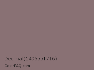 Decimal 1496551716 Color is a normal red color and the nearest color is Opium #8e6f70. Hex code #897174 and RGB value is rgb(137,113,116). In RGB color space, this color is composed of 54% red, 44% green, 45% blue, In CMYK color space, this color is composed of 0% cyan, 18% magenta, 15% yellow , 46% black , In HSL color space, this color has a hue angle of 353° , 10% saturation and 49% lightness.