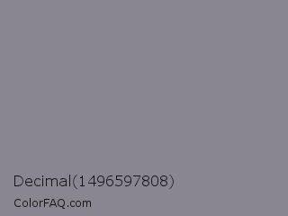 Decimal 1496597808 Color is a normal indigo color and the nearest color is Oslo Gray #878d91. Hex code #898692 and RGB value is rgb(137,134,146). In RGB color space, this color is composed of 54% red, 53% green, 57% blue, In CMYK color space, this color is composed of 6% cyan, 8% magenta, 0% yellow , 43% black , In HSL color space, this color has a hue angle of 255° , 5% saturation and 55% lightness.