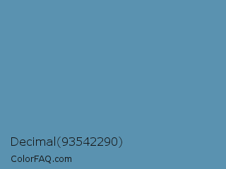 Decimal 93542290 Color is a normal blue color and the nearest color is Hippie Blue #589aaf. Hex code #5a92b0 and RGB value is rgb(90,146,176). In RGB color space, this color is composed of 35% red, 57% green, 69% blue, In CMYK color space, this color is composed of 49% cyan, 17% magenta, 0% yellow , 31% black , In HSL color space, this color has a hue angle of 201° , 35% saturation and 52% lightness.
