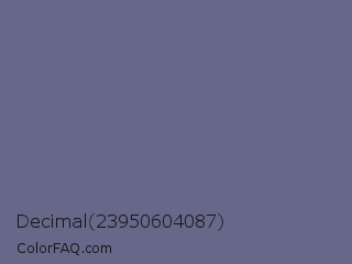 Decimal 23950604087 Color is a normal blue color and the nearest color is Dark Blue Gray #666699. Hex code #666789 and RGB value is rgb(102,103,137). In RGB color space, this color is composed of 40% red, 40% green, 54% blue, In CMYK color space, this color is composed of 26% cyan, 25% magenta, 0% yellow , 46% black , In HSL color space, this color has a hue angle of 238° , 15% saturation and 47% lightness.