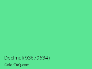 Decimal 93679634 Color is a light green color and the nearest color is Very Light Malachite Green #64e986. Hex code #5ae594 and RGB value is rgb(90,229,148). In RGB color space, this color is composed of 35% red, 90% green, 58% blue, In CMYK color space, this color is composed of 61% cyan, 0% magenta, 35% yellow , 10% black , In HSL color space, this color has a hue angle of 145° , 73% saturation and 63% lightness.