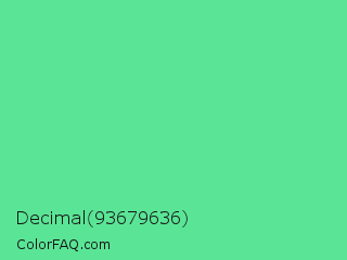 Decimal 93679636 Color is a light green color and the nearest color is Very Light Malachite Green #64e986. Hex code #5ae596 and RGB value is rgb(90,229,150). In RGB color space, this color is composed of 35% red, 90% green, 59% blue, In CMYK color space, this color is composed of 61% cyan, 0% magenta, 34% yellow , 10% black , In HSL color space, this color has a hue angle of 146° , 73% saturation and 63% lightness.