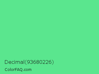 Decimal 93680226 Color is a light green color and the nearest color is Very Light Malachite Green #64e986. Hex code #5ae68e and RGB value is rgb(90,230,142). In RGB color space, this color is composed of 35% red, 90% green, 56% blue, In CMYK color space, this color is composed of 61% cyan, 0% magenta, 38% yellow , 10% black , In HSL color space, this color has a hue angle of 142° , 74% saturation and 63% lightness.