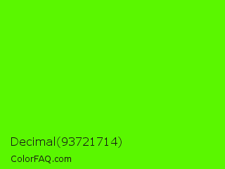 Decimal 93721714 Color is a normal green color and the nearest color is Bright Green #66ff00. Hex code #5af700 and RGB value is rgb(90,247,0). In RGB color space, this color is composed of 35% red, 97% green, 0% blue, In CMYK color space, this color is composed of 64% cyan, 0% magenta, 100% yellow , 3% black , In HSL color space, this color has a hue angle of 98° , 100% saturation and 48% lightness.