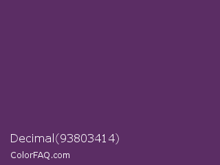 Decimal 93803414 Color is a dark purple color and the nearest color is Imperial #602f6b. Hex code #5b2d64 and RGB value is rgb(91,45,100). In RGB color space, this color is composed of 36% red, 18% green, 39% blue, In CMYK color space, this color is composed of 9% cyan, 55% magenta, 0% yellow , 61% black , In HSL color space, this color has a hue angle of 290° , 38% saturation and 28% lightness.