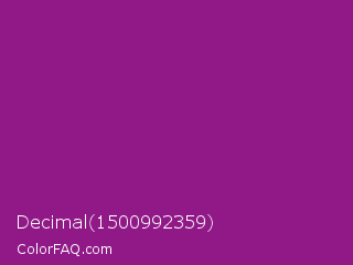 Decimal 1500992359 Color is a normal magenta color and the nearest color is Violet Eggplant #991199. Hex code #901987 and RGB value is rgb(144,25,135). In RGB color space, this color is composed of 56% red, 10% green, 53% blue, In CMYK color space, this color is composed of 0% cyan, 83% magenta, 6% yellow , 44% black , In HSL color space, this color has a hue angle of 305° , 70% saturation and 33% lightness.