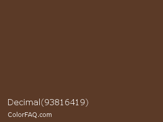 Decimal 93816419 Color is a dark orange color and the nearest color is Irish Coffee #5f3d26. Hex code #5b3a27 and RGB value is rgb(91,58,39). In RGB color space, this color is composed of 36% red, 23% green, 15% blue, In CMYK color space, this color is composed of 0% cyan, 36% magenta, 57% yellow , 64% black , In HSL color space, this color has a hue angle of 22° , 40% saturation and 25% lightness.