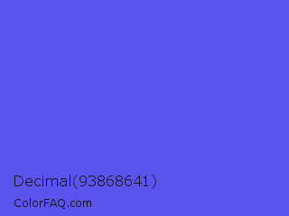 Decimal 93868641 Color is a light indigo color and the nearest color is Majorelle Blue #6050dc. Hex code #5b53ed and RGB value is rgb(91,83,237). In RGB color space, this color is composed of 36% red, 33% green, 93% blue, In CMYK color space, this color is composed of 62% cyan, 65% magenta, 0% yellow , 7% black , In HSL color space, this color has a hue angle of 243° , 81% saturation and 63% lightness.