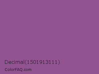 Decimal 1501913111 Color is a normal magenta color and the nearest color is Razzmic Berry #8d4e85. Hex code #915491 and RGB value is rgb(145,84,145). In RGB color space, this color is composed of 57% red, 33% green, 57% blue, In CMYK color space, this color is composed of 0% cyan, 42% magenta, 0% yellow , 43% black , In HSL color space, this color has a hue angle of 300° , 27% saturation and 45% lightness.