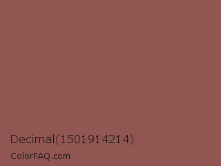 Decimal 1501914214 Color is a normal red color and the nearest color is Spicy Mix #8b5f4d. Hex code #915652 and RGB value is rgb(145,86,82). In RGB color space, this color is composed of 57% red, 34% green, 32% blue, In CMYK color space, this color is composed of 0% cyan, 41% magenta, 43% yellow , 43% black , In HSL color space, this color has a hue angle of 4° , 28% saturation and 45% lightness.