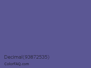 Decimal 93872535 Color is a normal indigo color and the nearest color is Butterfly Bush #624e9a. Hex code #5b5795 and RGB value is rgb(91,87,149). In RGB color space, this color is composed of 36% red, 34% green, 58% blue, In CMYK color space, this color is composed of 39% cyan, 42% magenta, 0% yellow , 42% black , In HSL color space, this color has a hue angle of 244° , 26% saturation and 46% lightness.