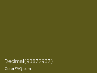 Decimal 93872937 Color is a dark yellow color and the nearest color is West Coast #625119. Hex code #5b5819 and RGB value is rgb(91,88,25). In RGB color space, this color is composed of 36% red, 35% green, 10% blue, In CMYK color space, this color is composed of 0% cyan, 3% magenta, 73% yellow , 64% black , In HSL color space, this color has a hue angle of 57° , 57% saturation and 23% lightness.