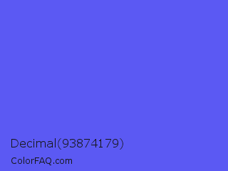 Decimal 93874179 Color is a light indigo color and the nearest color is Very Light Blue #6666ff. Hex code #5b59f3 and RGB value is rgb(91,89,243). In RGB color space, this color is composed of 36% red, 35% green, 95% blue, In CMYK color space, this color is composed of 63% cyan, 63% magenta, 0% yellow , 5% black , In HSL color space, this color has a hue angle of 241° , 87% saturation and 65% lightness.