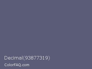 Decimal 93877319 Color is a normal blue color and the nearest color is Comet #5c5d75. Hex code #5b5c77 and RGB value is rgb(91,92,119). In RGB color space, this color is composed of 36% red, 36% green, 47% blue, In CMYK color space, this color is composed of 24% cyan, 23% magenta, 0% yellow , 53% black , In HSL color space, this color has a hue angle of 238° , 13% saturation and 41% lightness.