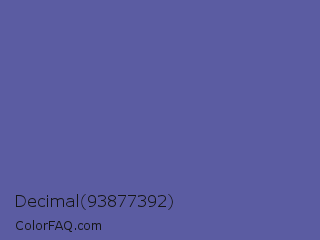 Decimal 93877392 Color is a normal blue color and the nearest color is Liberty #545aa7. Hex code #5b5ca2 and RGB value is rgb(91,92,162). In RGB color space, this color is composed of 36% red, 36% green, 64% blue, In CMYK color space, this color is composed of 44% cyan, 43% magenta, 0% yellow , 36% black , In HSL color space, this color has a hue angle of 239° , 28% saturation and 50% lightness.