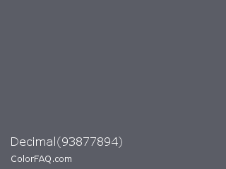 Decimal 93877894 Color is a normal blue color and the nearest color is Mid Gray #5f5f6e. Hex code #5b5d66 and RGB value is rgb(91,93,102). In RGB color space, this color is composed of 36% red, 36% green, 40% blue, In CMYK color space, this color is composed of 11% cyan, 9% magenta, 0% yellow , 60% black , In HSL color space, this color has a hue angle of 229° , 6% saturation and 38% lightness.
