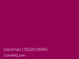 Decimal 1502610689 Color is a dark magenta color and the nearest color is Cardinal Pink #8c055e. Hex code #920255 and RGB value is rgb(146,2,85). In RGB color space, this color is composed of 57% red, 1% green, 33% blue, In CMYK color space, this color is composed of 0% cyan, 99% magenta, 42% yellow , 43% black , In HSL color space, this color has a hue angle of 325° , 97% saturation and 29% lightness.
