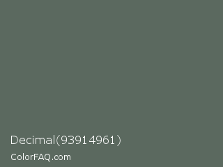 Decimal 93914961 Color is a normal green color and the nearest color is Storm Dust #646463. Hex code #5b695f and RGB value is rgb(91,105,95). In RGB color space, this color is composed of 36% red, 41% green, 37% blue, In CMYK color space, this color is composed of 13% cyan, 0% magenta, 10% yellow , 59% black , In HSL color space, this color has a hue angle of 137° , 7% saturation and 38% lightness.
