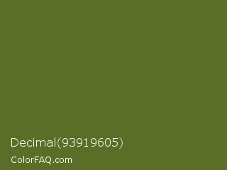 Decimal 93919605 Color is a dark lime color and the nearest color is Dark Olive Green #556b2f. Hex code #5b6e27 and RGB value is rgb(91,110,39). In RGB color space, this color is composed of 36% red, 43% green, 15% blue, In CMYK color space, this color is composed of 17% cyan, 0% magenta, 65% yellow , 57% black , In HSL color space, this color has a hue angle of 76° , 48% saturation and 29% lightness.