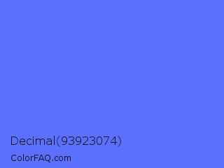 Decimal 93923074 Color is a light blue color and the nearest color is Very Light Blue #6666ff. Hex code #5b70fe and RGB value is rgb(91,112,254). In RGB color space, this color is composed of 36% red, 44% green, 100% blue, In CMYK color space, this color is composed of 64% cyan, 56% magenta, 0% yellow , 0% black , In HSL color space, this color has a hue angle of 232° , 99% saturation and 68% lightness.