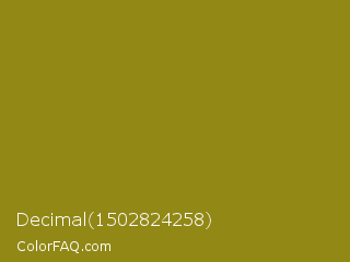Decimal 1502824258 Color is a normal yellow color and the nearest color is Hacienda #98811b. Hex code #928816 and RGB value is rgb(146,136,22). In RGB color space, this color is composed of 57% red, 53% green, 9% blue, In CMYK color space, this color is composed of 0% cyan, 7% magenta, 85% yellow , 43% black , In HSL color space, this color has a hue angle of 55° , 74% saturation and 33% lightness.