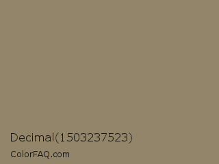 Decimal 1503237523 Color is a normal orange color and the nearest color is Arrowtown #948771. Hex code #938569 and RGB value is rgb(147,133,105). In RGB color space, this color is composed of 58% red, 52% green, 41% blue, In CMYK color space, this color is composed of 0% cyan, 10% magenta, 29% yellow , 42% black , In HSL color space, this color has a hue angle of 40° , 17% saturation and 49% lightness.