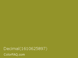 Decimal 1610625897 Color is a normal yellow color and the nearest color is Sycamore #908d39. Hex code #939429 and RGB value is rgb(147,148,41). In RGB color space, this color is composed of 58% red, 58% green, 16% blue, In CMYK color space, this color is composed of 1% cyan, 0% magenta, 72% yellow , 42% black , In HSL color space, this color has a hue angle of 61° , 57% saturation and 37% lightness.