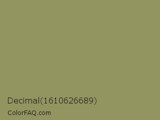 Decimal 1610626689 Color is a normal yellow color and the nearest color is Moss Green #8a9a5b. Hex code #939561 and RGB value is rgb(147,149,97). In RGB color space, this color is composed of 58% red, 58% green, 38% blue, In CMYK color space, this color is composed of 1% cyan, 0% magenta, 35% yellow , 42% black , In HSL color space, this color has a hue angle of 62° , 21% saturation and 48% lightness.