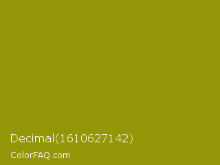 Decimal 1610627142 Color is a normal yellow color and the nearest color is Dark Yellow #9b870c. Hex code #939606 and RGB value is rgb(147,150,6). In RGB color space, this color is composed of 58% red, 59% green, 2% blue, In CMYK color space, this color is composed of 2% cyan, 0% magenta, 96% yellow , 41% black , In HSL color space, this color has a hue angle of 61° , 92% saturation and 31% lightness.