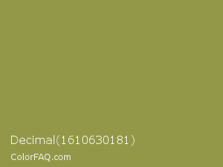 Decimal 1610630181 Color is a normal yellow color and the nearest color is Sycamore #908d39. Hex code #939849 and RGB value is rgb(147,152,73). In RGB color space, this color is composed of 58% red, 60% green, 29% blue, In CMYK color space, this color is composed of 3% cyan, 0% magenta, 52% yellow , 40% black , In HSL color space, this color has a hue angle of 64° , 35% saturation and 44% lightness.