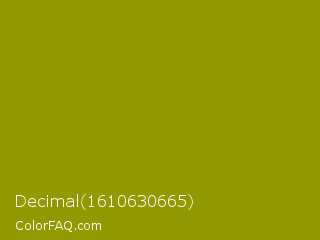 Decimal 1610630665 Color is a dark yellow color and the nearest color is Dark Yellow #9b870c. Hex code #939901 and RGB value is rgb(147,153,1). In RGB color space, this color is composed of 58% red, 60% green, 0% blue, In CMYK color space, this color is composed of 4% cyan, 0% magenta, 99% yellow , 40% black , In HSL color space, this color has a hue angle of 62° , 99% saturation and 30% lightness.
