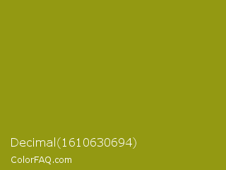 Decimal 1610630694 Color is a normal yellow color and the nearest color is Dark Yellow #9b870c. Hex code #939912 and RGB value is rgb(147,153,18). In RGB color space, this color is composed of 58% red, 60% green, 7% blue, In CMYK color space, this color is composed of 4% cyan, 0% magenta, 88% yellow , 40% black , In HSL color space, this color has a hue angle of 63° , 79% saturation and 34% lightness.