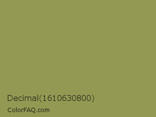 Decimal 1610630800 Color is a normal yellow color and the nearest color is Moss Green #8a9a5b. Hex code #939952 and RGB value is rgb(147,153,82). In RGB color space, this color is composed of 58% red, 60% green, 32% blue, In CMYK color space, this color is composed of 4% cyan, 0% magenta, 46% yellow , 40% black , In HSL color space, this color has a hue angle of 65° , 30% saturation and 46% lightness.