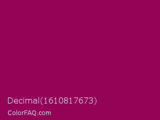 Decimal 1610817673 Color is a dark magenta color and the nearest color is Cardinal Pink #8c055e. Hex code #940459 and RGB value is rgb(148,4,89). In RGB color space, this color is composed of 58% red, 2% green, 35% blue, In CMYK color space, this color is composed of 0% cyan, 97% magenta, 40% yellow , 42% black , In HSL color space, this color has a hue angle of 325° , 95% saturation and 30% lightness.
