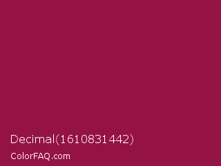 Decimal 1610831442 Color is a normal rose color and the nearest color is Disco #871550. Hex code #941244 and RGB value is rgb(148,18,68). In RGB color space, this color is composed of 58% red, 7% green, 27% blue, In CMYK color space, this color is composed of 0% cyan, 88% magenta, 54% yellow , 42% black , In HSL color space, this color has a hue angle of 337° , 78% saturation and 33% lightness.