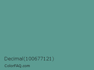 Decimal 100677121 Color is a normal cyan color and the nearest color is Patina #639a8f. Hex code #5b9b91 and RGB value is rgb(91,155,145). In RGB color space, this color is composed of 36% red, 61% green, 57% blue, In CMYK color space, this color is composed of 41% cyan, 0% magenta, 6% yellow , 39% black , In HSL color space, this color has a hue angle of 171° , 26% saturation and 48% lightness.
