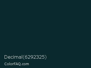 Decimal 6292325 Color is a very dark cyan color and the nearest color is Firefly #0e2a30. Hex code #09292d and RGB value is rgb(9,41,45). In RGB color space, this color is composed of 4% red, 16% green, 18% blue, In CMYK color space, this color is composed of 80% cyan, 9% magenta, 0% yellow , 82% black , In HSL color space, this color has a hue angle of 187° , 67% saturation and 11% lightness.
