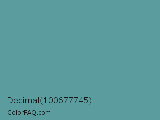 Decimal 100677745 Color is a normal cyan color and the nearest color is Cadet Blue #5f9ea0. Hex code #5b9c9f and RGB value is rgb(91,156,159). In RGB color space, this color is composed of 36% red, 61% green, 62% blue, In CMYK color space, this color is composed of 43% cyan, 2% magenta, 0% yellow , 38% black , In HSL color space, this color has a hue angle of 183° , 27% saturation and 49% lightness.