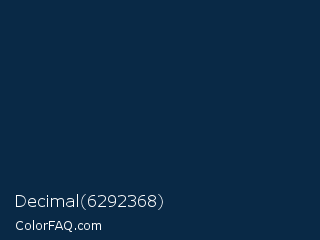 Decimal 6292368 Color is a very dark blue color and the nearest color is Blue Whale #042e4c. Hex code #092946 and RGB value is rgb(9,41,70). In RGB color space, this color is composed of 4% red, 16% green, 27% blue, In CMYK color space, this color is composed of 87% cyan, 41% magenta, 0% yellow , 73% black , In HSL color space, this color has a hue angle of 209° , 77% saturation and 15% lightness.