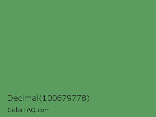Decimal 100679778 Color is a normal green color and the nearest color is Fruit Salad #4f9d5d. Hex code #5b9d5e and RGB value is rgb(91,157,94). In RGB color space, this color is composed of 36% red, 62% green, 37% blue, In CMYK color space, this color is composed of 42% cyan, 0% magenta, 40% yellow , 38% black , In HSL color space, this color has a hue angle of 123° , 27% saturation and 49% lightness.