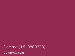Decimal 1610880338 Color is a normal rose color and the nearest color is Dark Raspberry #872657. Hex code #942950 and RGB value is rgb(148,41,80). In RGB color space, this color is composed of 58% red, 16% green, 31% blue, In CMYK color space, this color is composed of 0% cyan, 72% magenta, 46% yellow , 42% black , In HSL color space, this color has a hue angle of 338° , 57% saturation and 37% lightness.