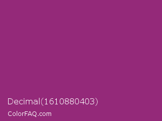 Decimal 1610880403 Color is a normal magenta color and the nearest color is Razzmic Berry Crayola #843179. Hex code #942979 and RGB value is rgb(148,41,121). In RGB color space, this color is composed of 58% red, 16% green, 47% blue, In CMYK color space, this color is composed of 0% cyan, 72% magenta, 18% yellow , 42% black , In HSL color space, this color has a hue angle of 315° , 57% saturation and 37% lightness.