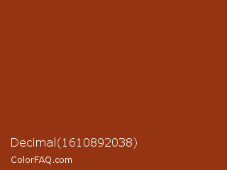 Decimal 1610892038 Color is a normal orange color and the nearest color is Kobe #882d17. Hex code #943412 and RGB value is rgb(148,52,18). In RGB color space, this color is composed of 58% red, 20% green, 7% blue, In CMYK color space, this color is composed of 0% cyan, 65% magenta, 88% yellow , 42% black , In HSL color space, this color has a hue angle of 16° , 78% saturation and 33% lightness.