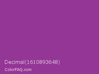 Decimal 1610893648 Color is a normal magenta color and the nearest color is Vivid Violet #803790. Hex code #943696 and RGB value is rgb(148,54,150). In RGB color space, this color is composed of 58% red, 21% green, 59% blue, In CMYK color space, this color is composed of 1% cyan, 64% magenta, 0% yellow , 41% black , In HSL color space, this color has a hue angle of 299° , 47% saturation and 40% lightness.